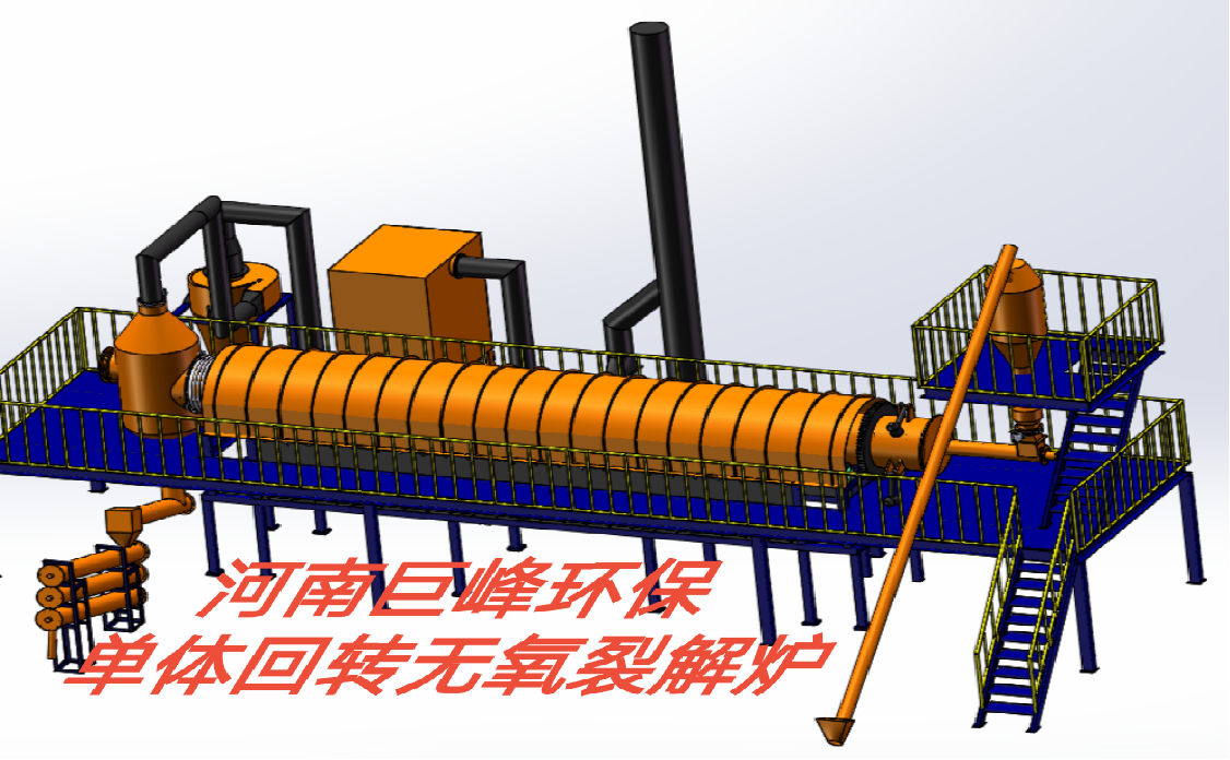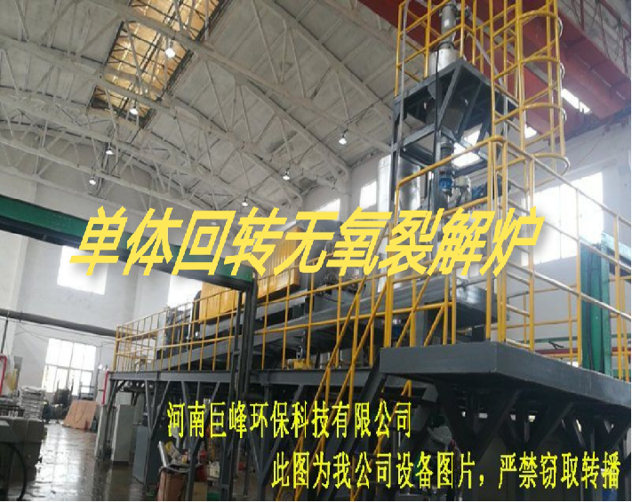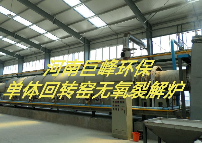單體回轉(zhuǎn)無(wú)氧裂解爐型為單體式回轉(zhuǎn)式,爐內(nèi)壁中有螺旋撥片,物料靠回轉(zhuǎn)窯的水平角度或螺旋葉片滾筒旋轉(zhuǎn)進(jìn)行推進(jìn),加熱方式為外爐筒加熱。