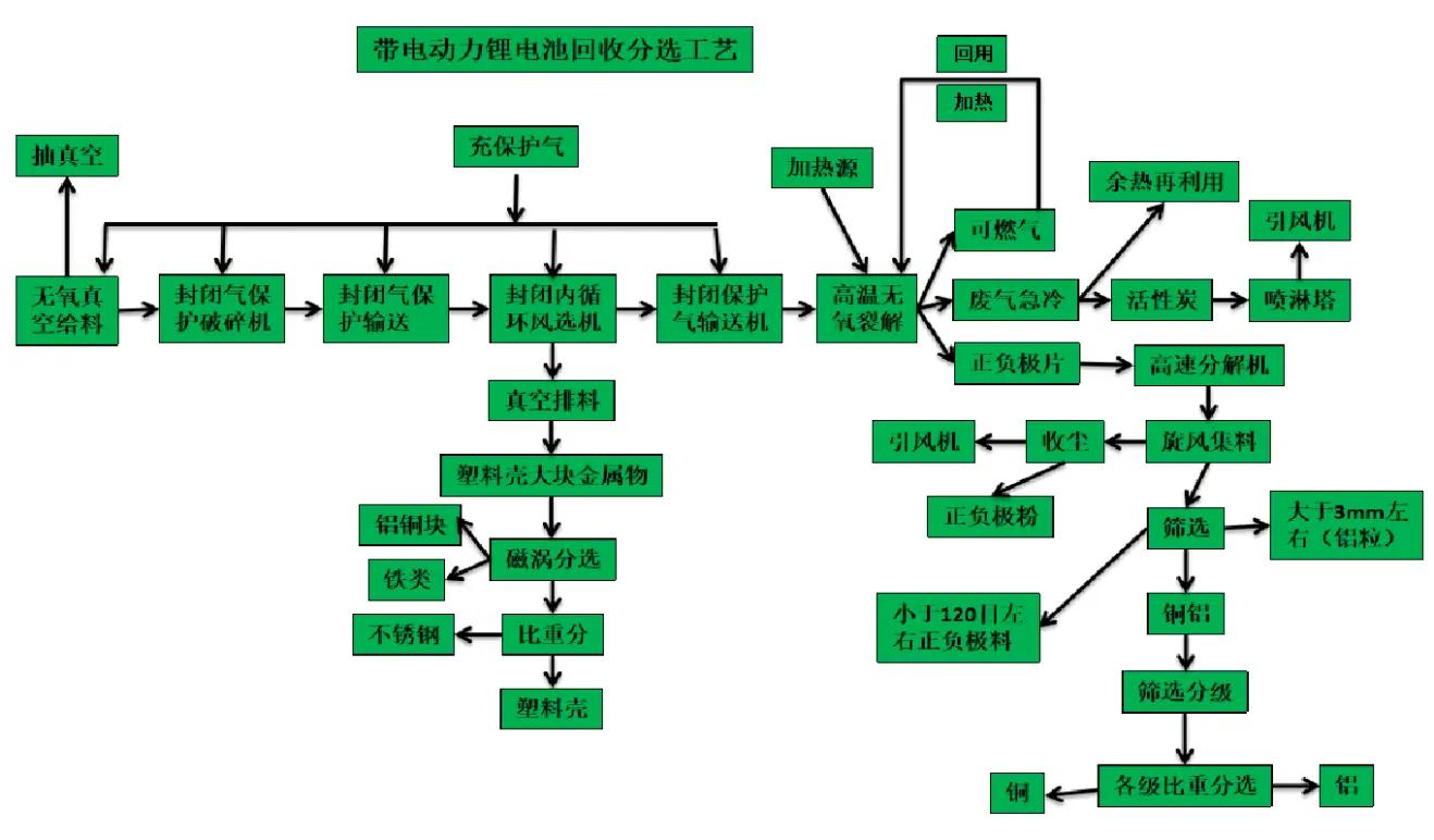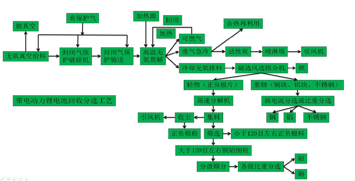 為了防止帶電的鋰電池進入系統會與空氣中某些帶電物質發生反應產生爆炸,所以先抽真空注入保護氣。然后就是無氧熱裂解爐進行一系列的處理。分選出資源可以在利用的物料例如,銅、鋁、不銹鋼、塑料殼等。