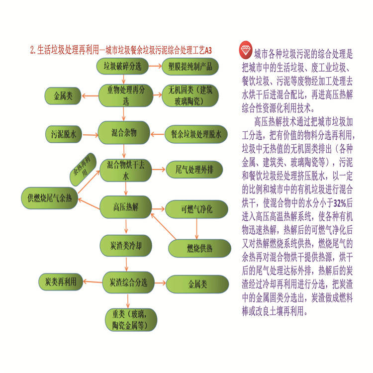 城市里各種垃圾污泥綜合處理是把城市中的生活垃圾、廢工業(yè)垃圾、餐飲垃圾、污泥等廢物經(jīng)加工處理去水烘干后進混合配比,再進高壓熱解綜合性資源化利技術。