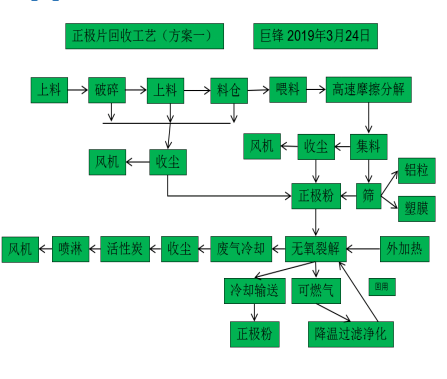 2、綜合分選循環風系:揮發后鋰電物料進綜合分選可把鋰電池分選為4類①磁性物(鐵和鎳)②塑料隔膜③銅塊鋁塊不銹鋼殼體等④正負極片料;極片直接進摩擦脫粉設備,分選風為全循環使用;把少量排出廢氣進裂解燃燒系統進行補充氧用。