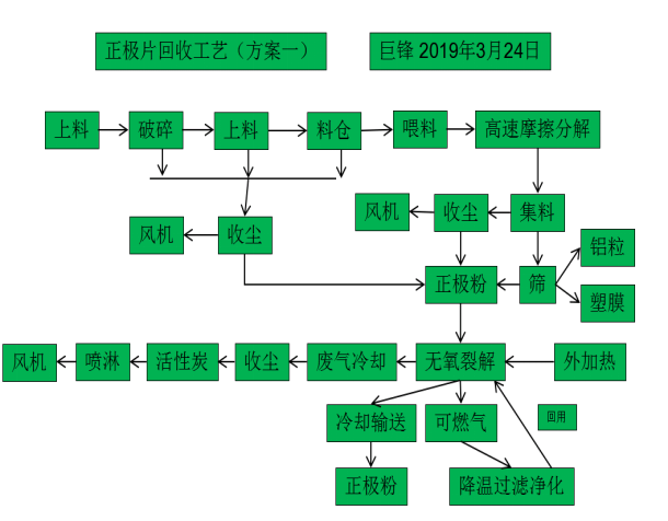 廢舊鋰電池里的正極片經破進無氧裂解爐,可燃氣凈化回用,廢氣處理排放。裂解極片經篩選、高速摩擦、除塵集料等工序,得較純正極粉和鋁粒。